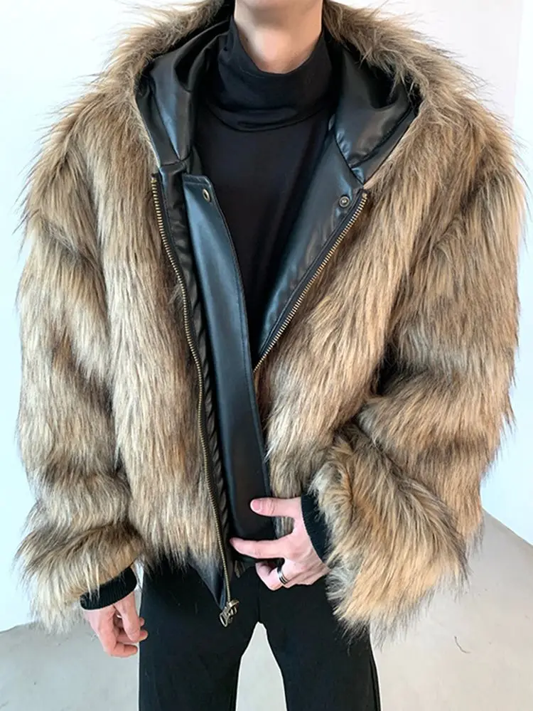 Men Faux Fur Jacket Coat Pu Leather 2025 Winter Thick Warm Outerwear Spliced Hooded Zipper Pockets Vintage High Street Overcoat