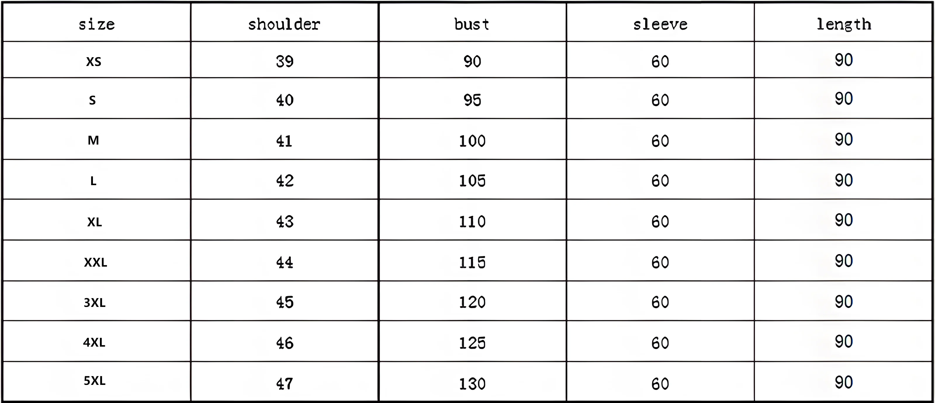 size_info: {"sizeInfoList":[{"length":{"cm":"90","inch":"35.43"},"size":"XS","vid":-1},{"length":{"cm":"95","inch":"37.40"},"size":"S","vid":-2},{"length":{"cm":"100","inch":"39.37"},"size":"M","vid":-3},{"length":{"cm":"105","inch":"41.34"},"size":"L","vid":-4},{"length":{"cm":"110","inch":"43.31"},"size":"XL","vid":-5},{"length":{"cm":"115","inch":"45.28"},"size":"XXL","vid":-6},{"length":{"cm":"120","inch":"47.24"},"size":"3XL","vid":-7},{"length":{"cm":"125","inch":"49.21"},"size":"4XL","vid":-8},{"length":{"cm":"130","inch":"51.18"},"size":"5XL","vid":-9}]}
