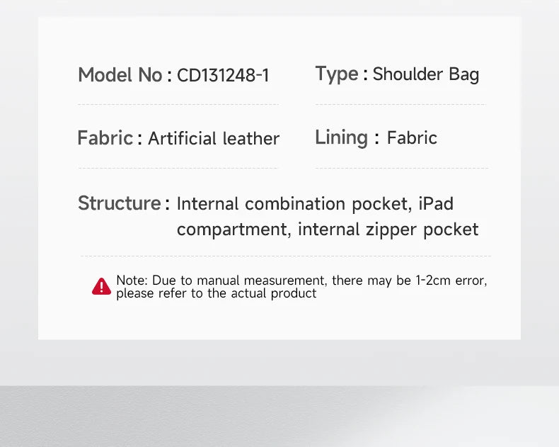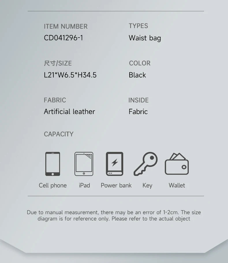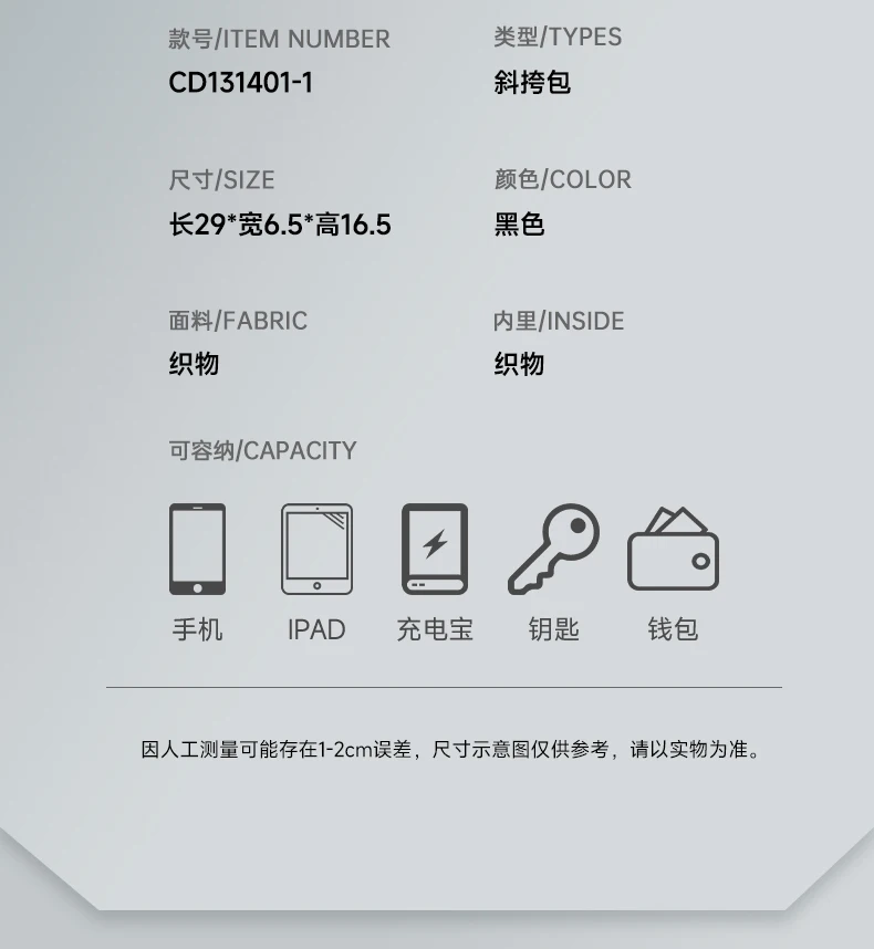 ✅Size: 16cm*6cm*30cm, the main bag capacity can hold a 7.9-inch mini iPad. The bag body has a multi-layered structure, making it easier to sort and take out items.